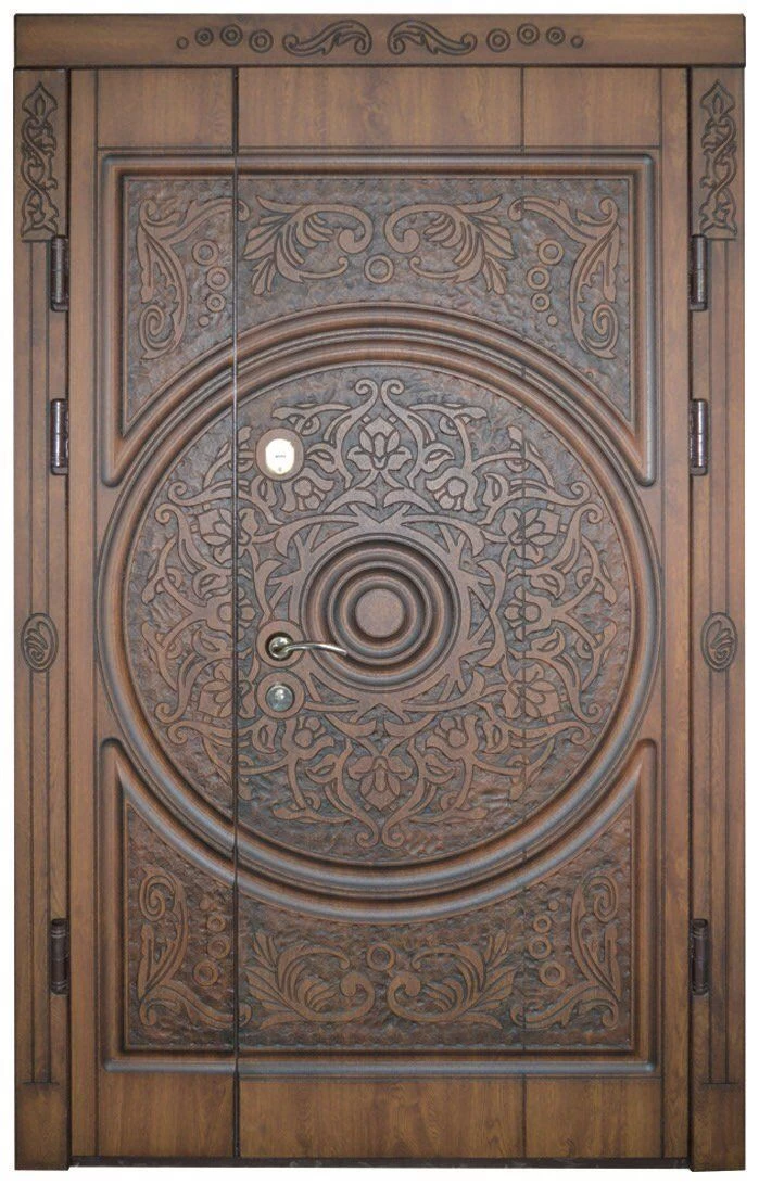 Парадные двери относятся к изделиям премиум-класса. Изготавливаются такие модели из металла толщиной не менее 2,0 мм, конструкция усиливается ребрами жесткости. Основной фактор, делающий парадные двери таковыми – их внешняя отделка. Для декора этих дверей, как правило, используют массив дуба, ясеня или сосны, натуральный шпон, корабельную фанеру, МДФ-панель, покрытую атмосфероустойчивой пленкой Винорит (VINORIT). Декоративные вставки из антивандального стекла, с применением элементов ковки, рисунок, который будет сочетаться с рисунком решеток на окнах, придаст коттеджу неповторимый внешний вид. Можно декорировать дверь витражным узором – и ваш дом заиграет яркими красками. По конструкции парадные двери могут быть как одностворчатыми, так и двустворчатым. При достаточной высоте проема, можно изготовить входную группу с декоративной вставкой сверху – прямоугольную или в виде арки. Терморазрыв в конструкции парадной двери сохранит тепло в доме, и предотвратит промерзание и кондедсирование двери в холодное время года, при этом не требуется обустройство в доме холодного тамбура.