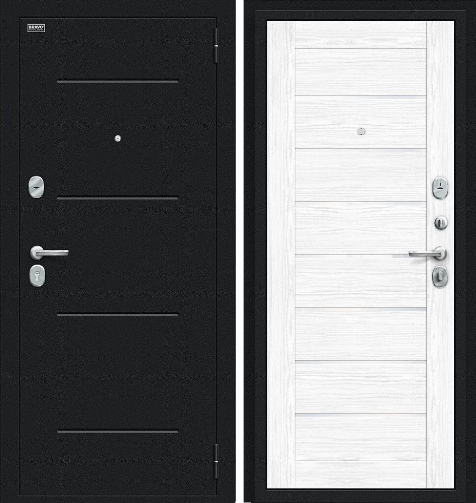 Надежная входная Дверь Браво Техно Букле черное/Snow Melinga премиум класса по цене 31 085 руб. Большая толщина стали защитит от проникновения в ваш дом, квартиру или коттедж. Используется очень качественная фурнитура: замки, цилиндры, ручки, защелки. Покрытие и отделка двери изготовлено под внимательным контролем производителя. Дверь имеет долгий срок службы и гарантию.
